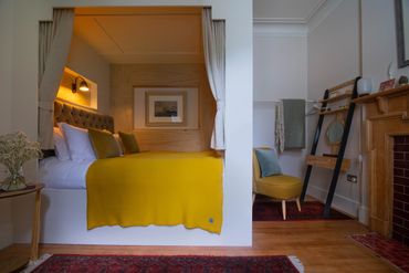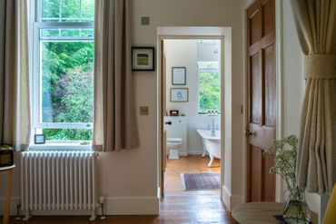 A bespoke wood and tweed croft bed is the star of Roost. Like its own softly curtained cabin, nothing could be cosier or more charming. The ensuite has a big cast iron tub in the warmly glamorous ensuite bathroom that’s been in position since 1927. Roost is in the Arts and Crafts wing of the house and its windows look at the forested green banks that surround Home Farm, dotted with deer and red squirrel in the mornings.