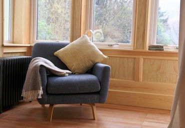 A place to eat and relax long into the evenings. Big dining table, massive sofa, open fire, windows overlooking the garden - and a door leading to the outside covered terrace, where you can sit and eat too. In the Arts and Crafts section of the house, this room is completely cast with the golden colour of the Douglas fir in its original floorboards, panelling and even the dining table. It’s a suntrap in here (and especially on the terrace) mornings and late afternoons: coffee, or sundowner bliss. The lawn just outside is fringed by high trees that the sun sets directly through and beyond – it’s a romantic sight. Red squirrels leap about the trees or patrol the grass looking for the nuts they buried that morning (but can’t recall quite where….)