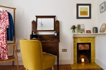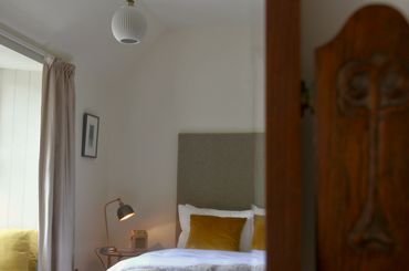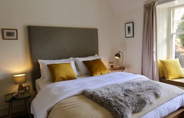 A ‘jaggy bush’ is our childhood nickname for the yellow gorse flowers and thorns that thickly stud the hills and highland behind Home Farm most months of the year. That colour – like condensed Autumn sunlight – finds its way into the newly woven tweed window-seats of this room, which is the oldest in the house and part of the building that dates to the 1600’s. There’s a cottage feel in here. Comfy bed, Laura Thomas products in the bathroom. You’re likely to hear our barn owls making their forays at dusk – they’ve lived in the stable beyond the window for years.