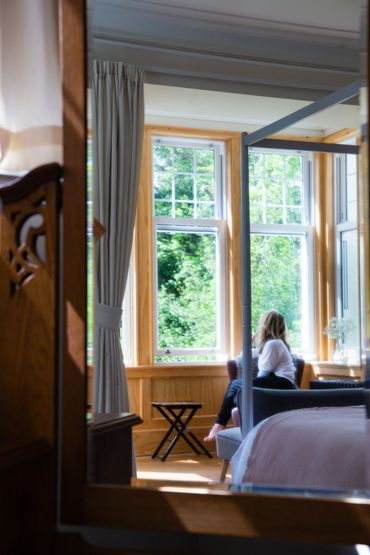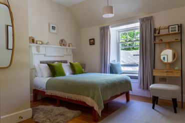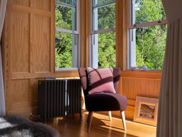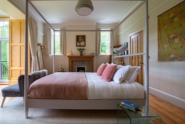 Our biggest bedroom - called Douglas Fir because of the unusual, highly-patterned grain in the old wood that prettily panels the windows, doors and floors throughout the house. Hebridean light bursts through this room’s many high windows. There’s an ensuite bathroom, and a four-poster overlooking woodland and hills.
