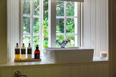 During the renovations at Home Farm we found a little wren living in this room and she’s still here in spirit. This is our smallest bedroom, a sweet nest full of indulgence and detail. A newly-woven tweed headboard and window-seats; oil paintings by Scottish artist Daisy Williams; Laura Thomas products in the bathroom with its window overlooking a wooded bank; cedarwood candles.